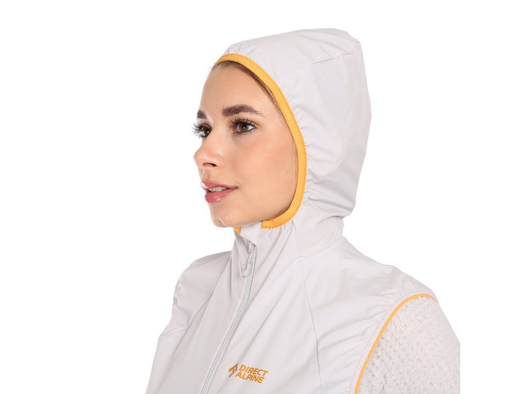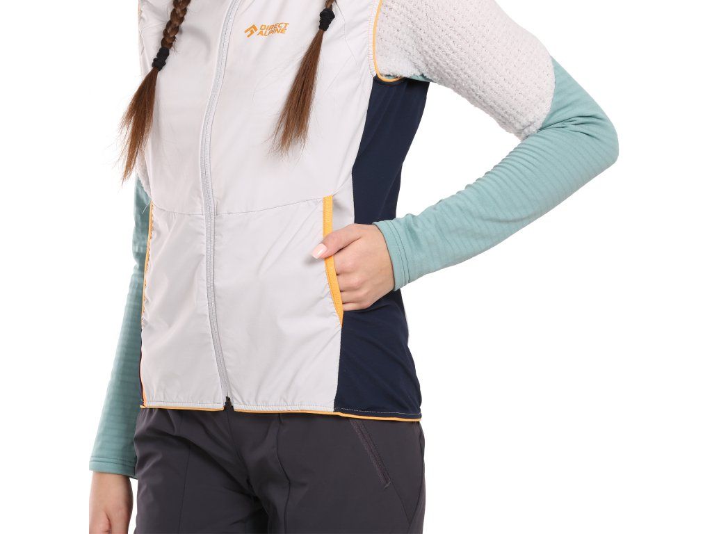 Hlavní materiál tvoří lehká strečová tkanina z polyamidu a elastanu (Creora®), která zajišťuje volnost pohybu a odolnost. DWR úprava chrání před lehkým deštěm a vlhkostí. Prodyšné mesh panely zlepšují ventilaci při náročných aktivitách. Vesta je snadno sbalitelná, takže ji můžete mít vždy po ruce jako záložní vrstvu.