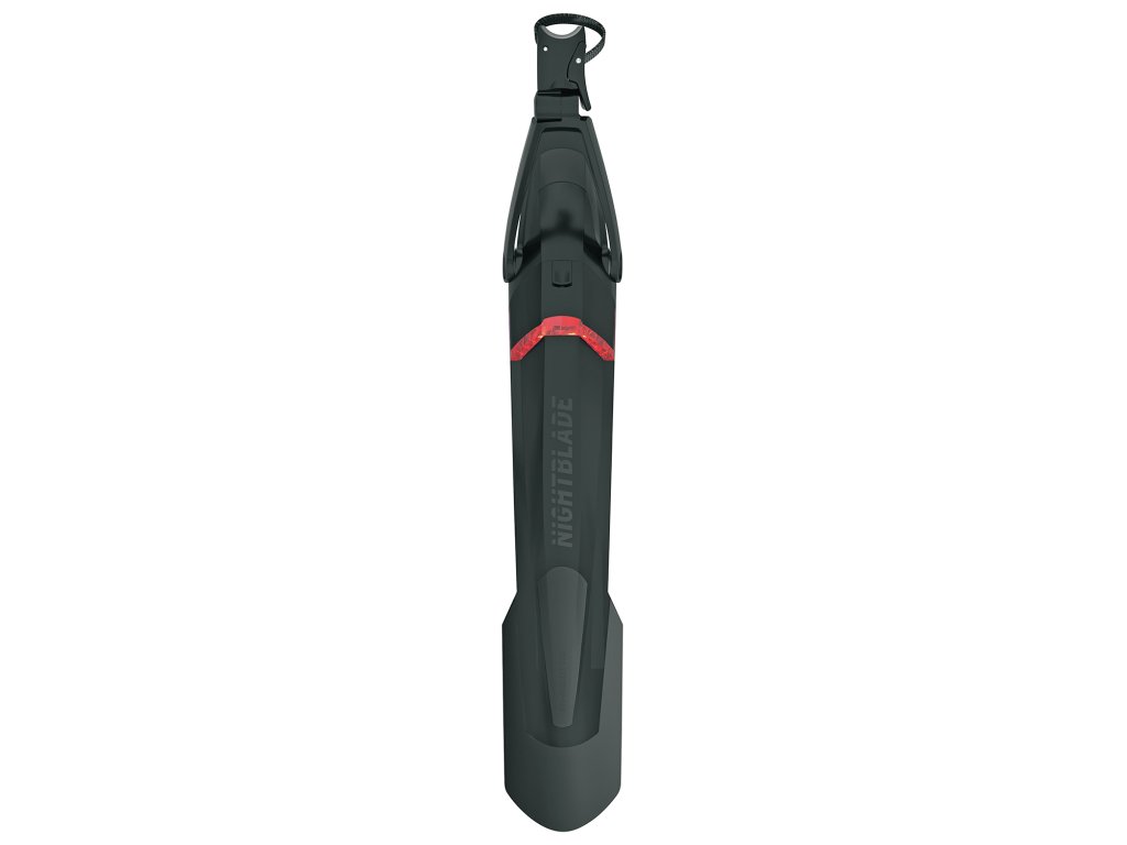 Blatník SKS Night Blade využívá dvoukloubovou technologii pro snadné přizpůsobení tvaru rámu a sklonu blatníku. Montáž je velmi rychlá a bez použití nářadí – stačí ho upevnit pomocí PowerStrap pásků na sedlovku. Spoilery z měkčeného plastu zároveň slouží jako ochrana proti nárazům při nasedání nebo manipulaci s kolem. Integrované zadní světlo je odnímatelné, dobíjí se přes USB a splňuje přísné normy pro provoz na veřejných komunikacích.